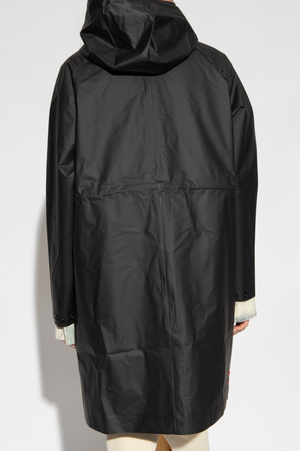 Black rain coat from Hunter. Fastened with a zip and snaps, this design features a drawstring hood, two snap-fastened pockets, long sleeves and logo patch in white, red and black.