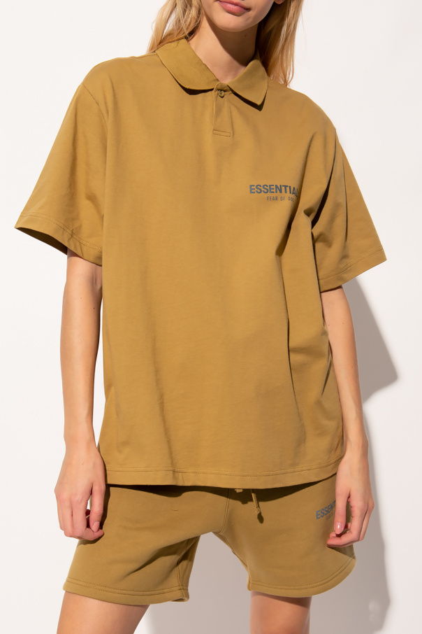 Light green polo shirt from Fear Of God Essentials. Crafted from cotton, this short sleeve design features button fastenings, silver-tone reflective logo print and a rubber appliqué at the back.