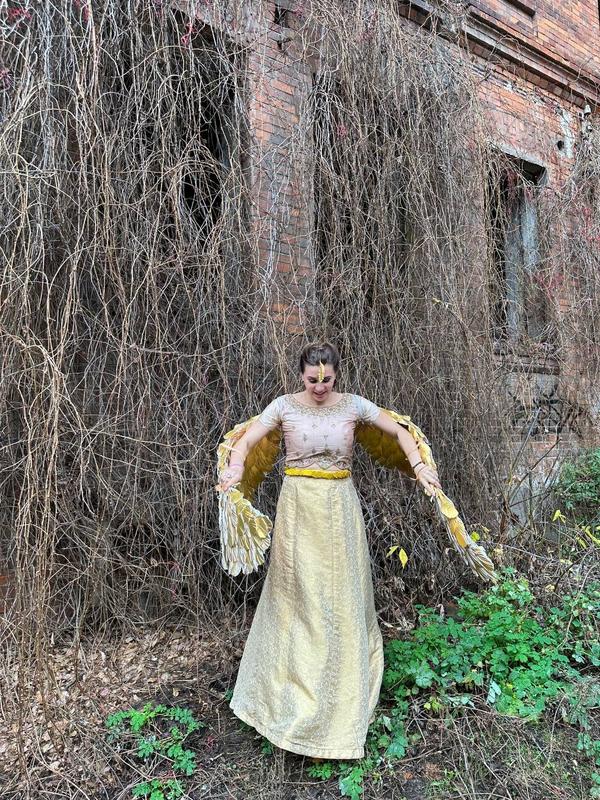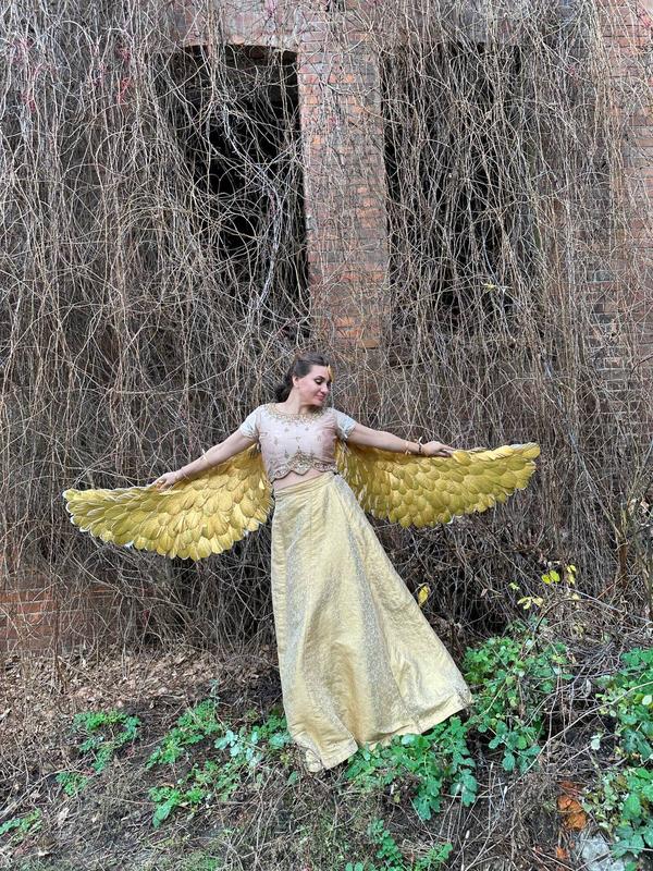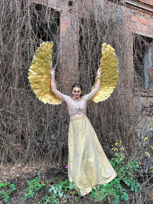 Золотые крылья ангела прикреплены лентами на руке. Легкий и невесомый. Сделаны из материала, который выдерживает ветер, дождь, бассейн. Крылья прослужат вам долгие годы.