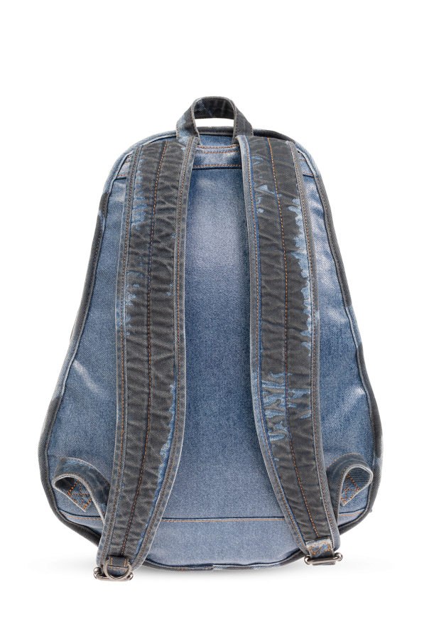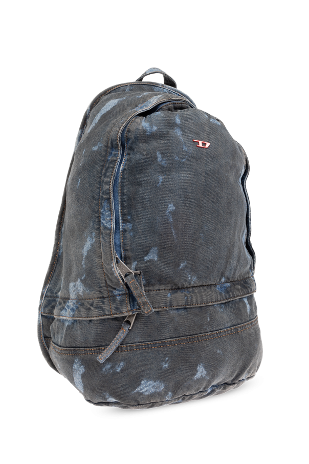 Dark grey and blue ‘RAVE’ denim backpack from Diesel. Fastened with a two-way zip, this model features a pattern, metal logo detail in red, zipped front pocket, top handle, adjustable shoulder straps, silver-tone metal hardware and one internal compartment with a laptop pocket.
