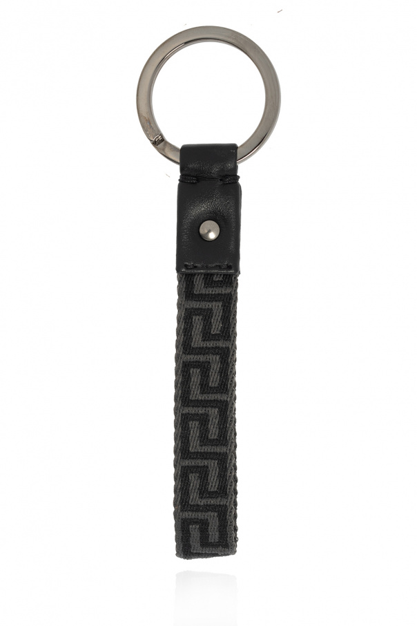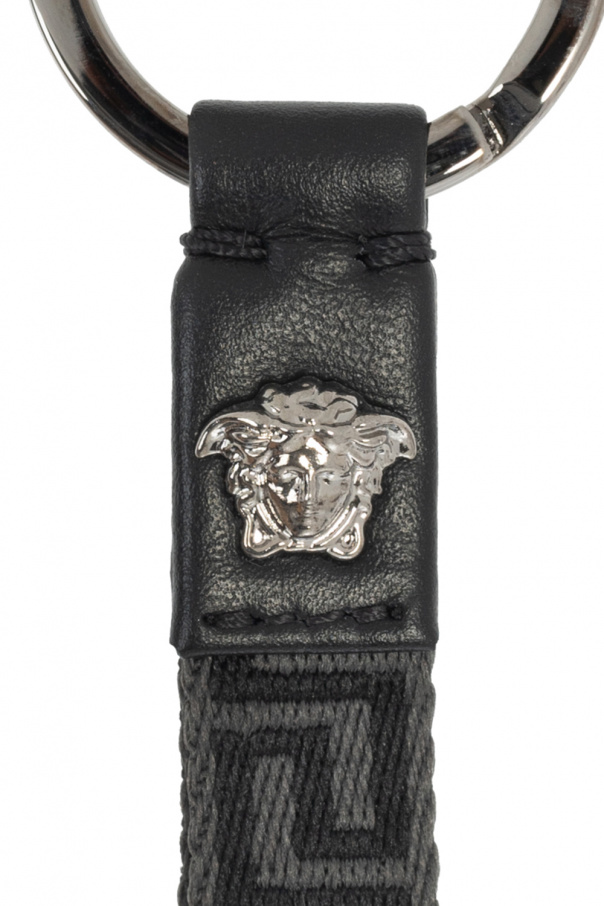 Black and grey keyring with a strap from Versace. This item features an embroidered pattern, silver-tone metal hardware and the iconic raised Medusa head appliqué.