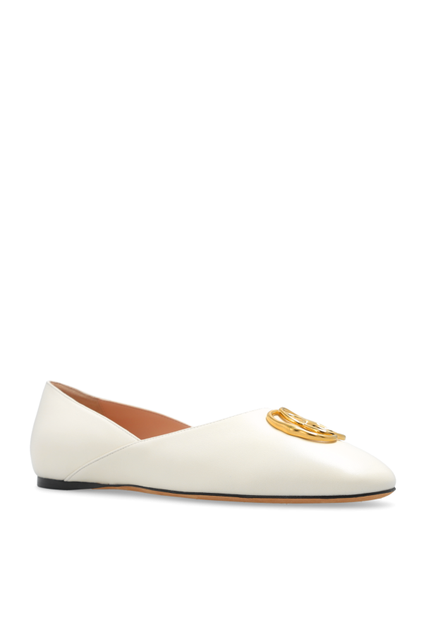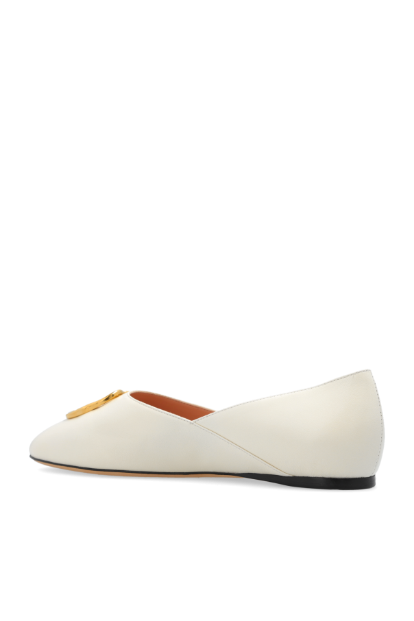 Cream ‘Gerry’ ballet flats from Bally. Made from lamb leather with a round toe, this model sits on a beige and black leather sole and features a gold-tone metal logo plaque on the front.