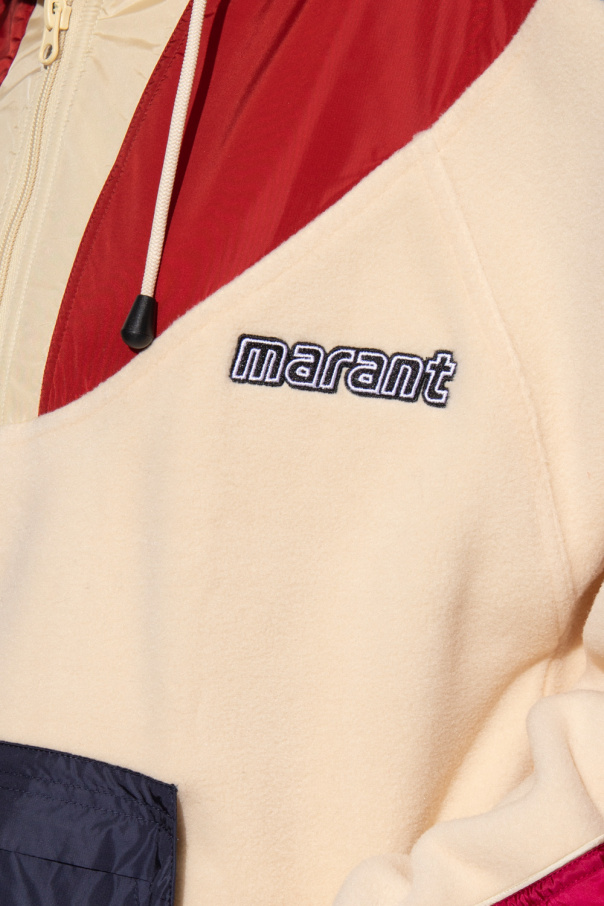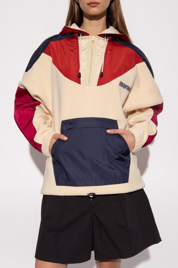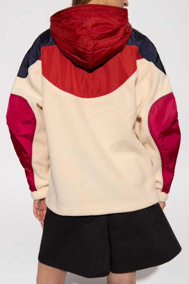 Cream hoodie from Isabel Marant Étoile. Embellished with an embroidered black and white logo, this style showcases a half-zip closure, red-navy blue-pink panelling, a zipped pocket on the front, a drawcord-adjustable hood and hem and long sleeves with elasticated cuffs.