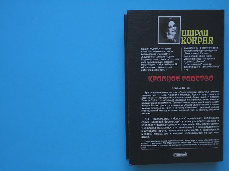 Ширли Конран. Кровавое родство. В 2-х т. “Мировой бестселлер”– МБ”. М., “Новости”, 1995, 320с. + 336с. Твердая обложка, супер обложка с золотым тиснением..