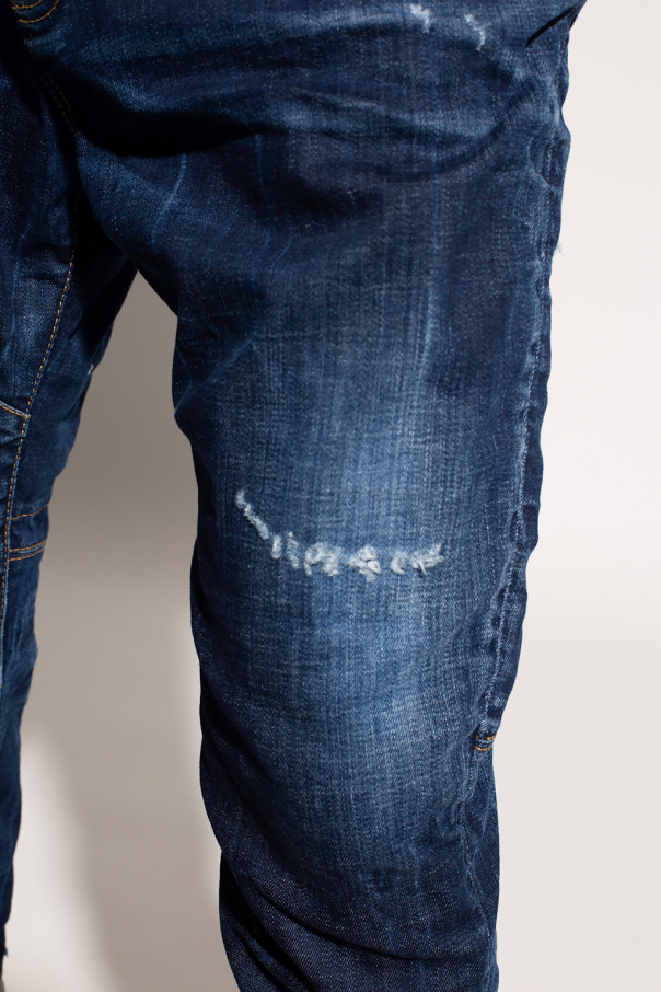 Navy ‘Combat’ jeans from Dsquared2. Fastened with buttons, this design features a logo patch, yellow stitching details, three front pockets, two back pockets, turn up cuffs and raw trims.
