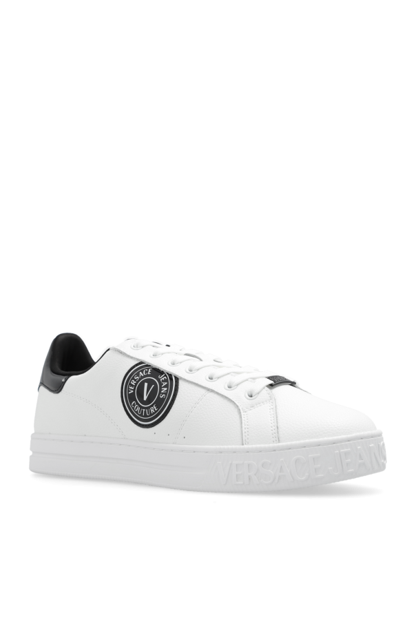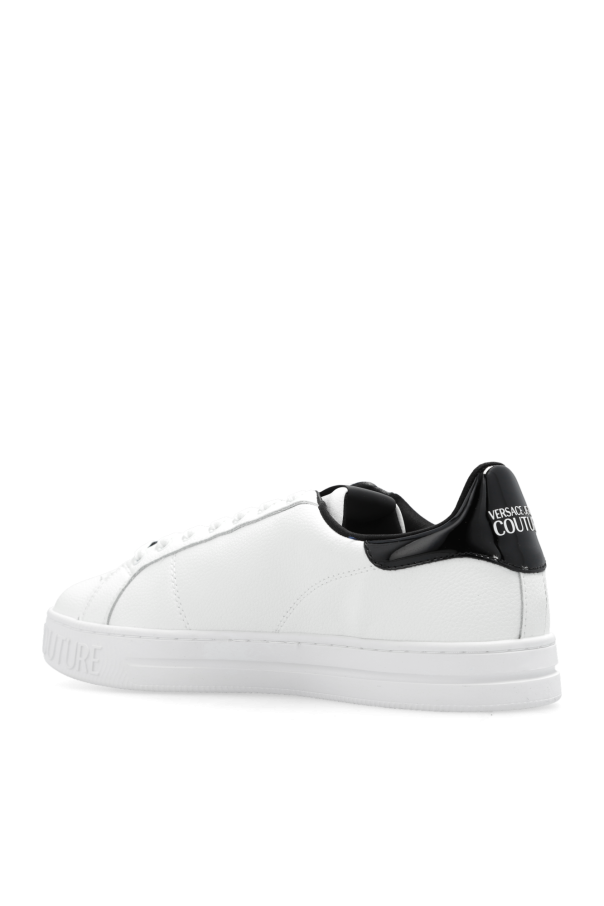 White and black sneakers from Versace Jeans Couture. Made from grained leather, this lace-up model sits on a white rubber sole and showcases a logo-engraved application and logo patches.