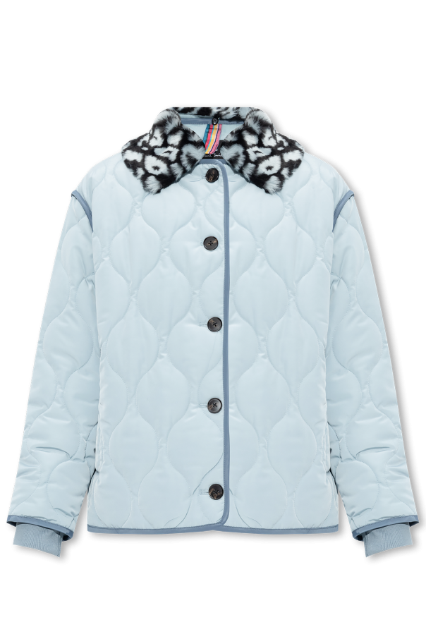 Light blue quilted jacket with light insulation from PS Paul Smith. Fastened with buttons, this design features a detachable faux fur collar, black animal pattern, two slip pockets and long sleeves.