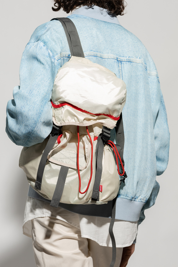 Yellow, red and grey ‘ROGUE’ backpack from Diesel. Fastened with snaps, this design features three frontal pockets, adjustable shoulder strap and a drawstring interior with a slip pocket.