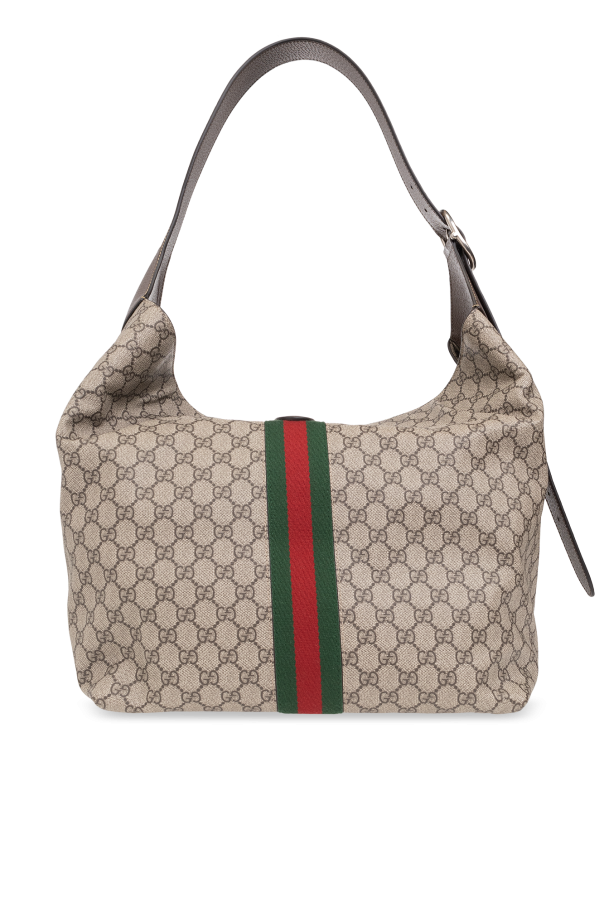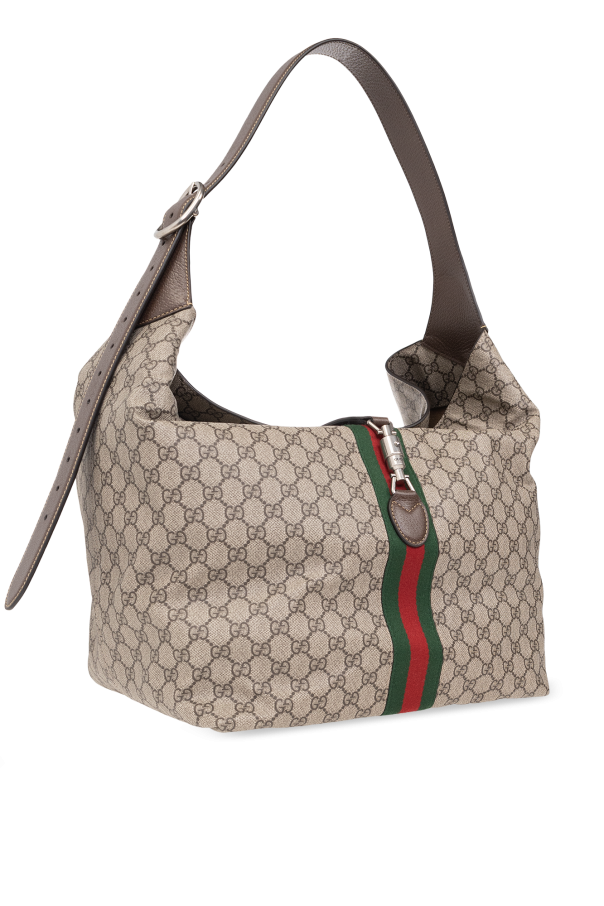 Beige and brown ‘Jackie 1961 Medium’ shoulder bag from Gucci. Made of ‘GG Supreme’ canvas finished with leather, this design features a decorative snap closure with an engraved logo, monogram pattern and ‘Web’ stripe in green and red, adjustable shoulder strap, one internal compartment with a detachable snap-fastened pouch and antiqued silver-tone metal hardware.