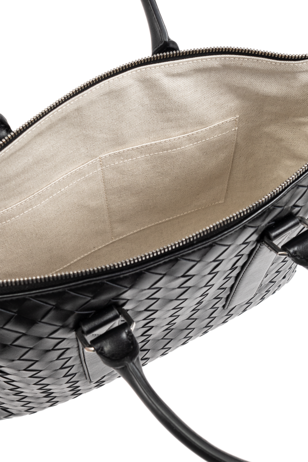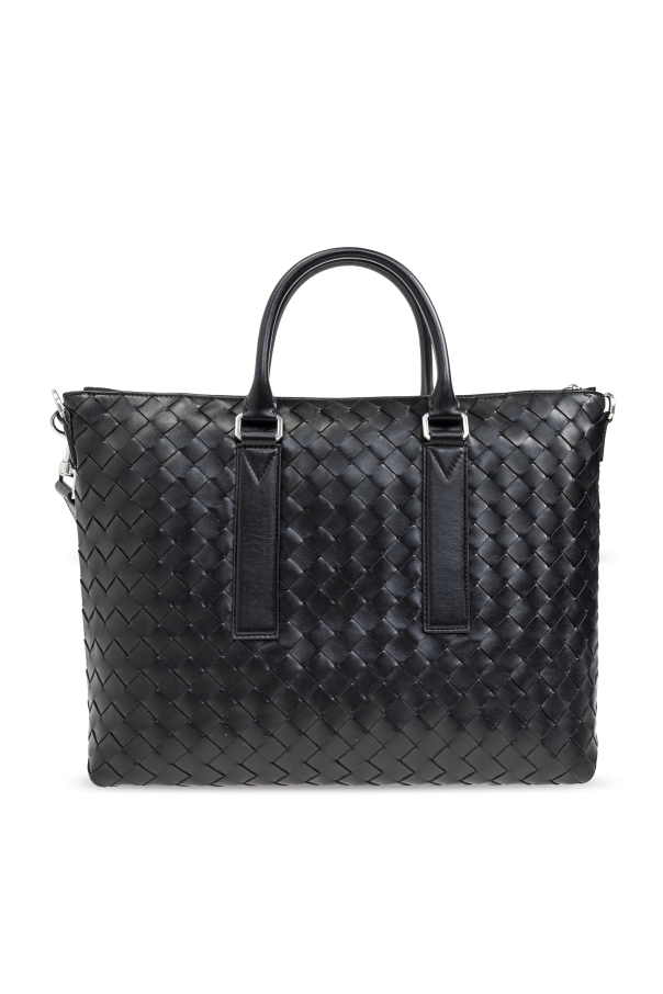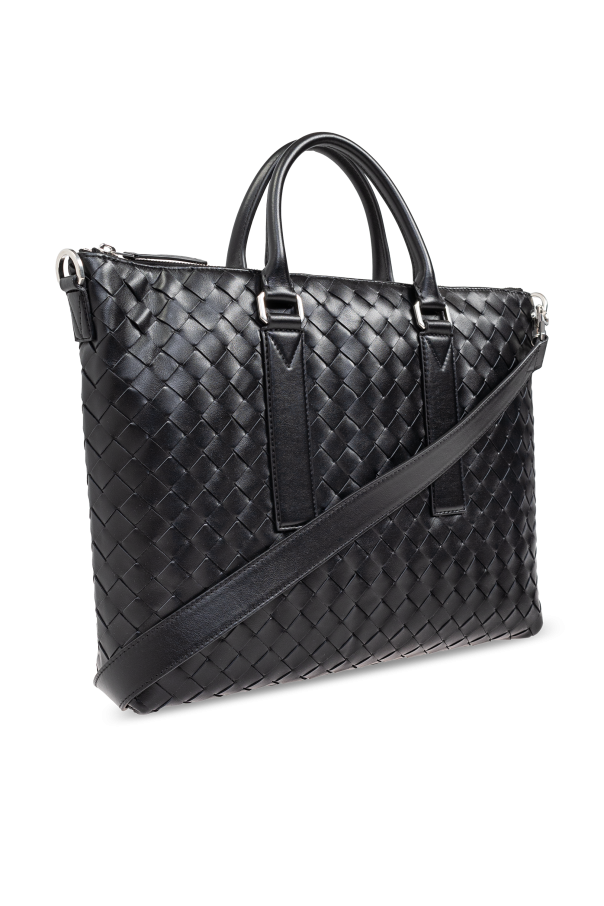 Introducing the Intrecciato Soft Briefcase, a quintessential piece from the prestigious Bottega Veneta collection. This luxurious briefcase epitomizes sophistication with its rectangular shape crafted from premium calfskin leather. The distinctive woven pattern exudes elegance, complemented by a deep black hue that enhances its exclusivity. The briefcase is designed with versatility in mind, featuring two short handles and a detachable, adjustable shoulder strap, allowing for multiple carrying options. Silver-toned metal accents, including clasps, add a touch of refinement. Inside, the bright lining and strategically placed pockets, including three compartments, ensure seamless organization. This exquisite accessory is both functional and stylish, embodying the essence of a luxury item. Why choose this product? Handcrafted by the illustrious Bottega Veneta, rooted in Italian heritage. Features a unique woven pattern, a hallmark of elegance. Constructed from high-quality calfskin leather. Offers versatile carrying options with an adjustable strap. Interior designed for optimal organization and accessibility.