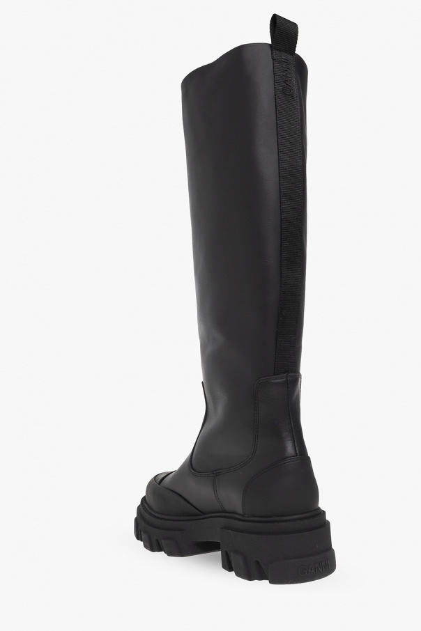 Black boots from Ganni. Made of calf leather, this pair features a black grosgrain pull tab with a logo print and a black rubber sole.