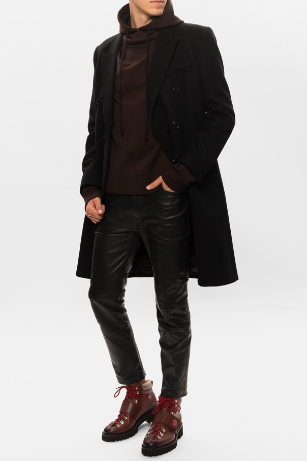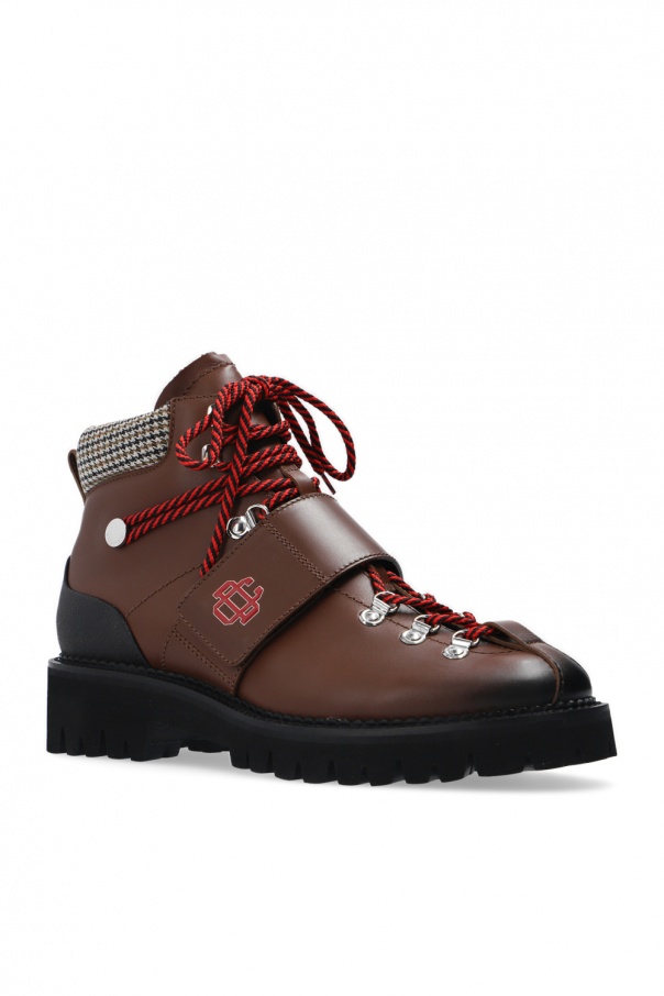 Brown and black lace-up boots from Dsquared2. Crafted from leather, this style features velcro fastening to the side, metal logo-embossed elements in silver-tone, a red and white logo on the side, textured fabric trims, red and black laces and a black rubber sole at the base.