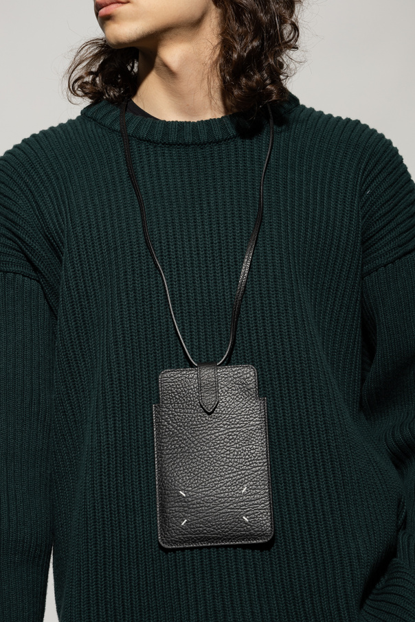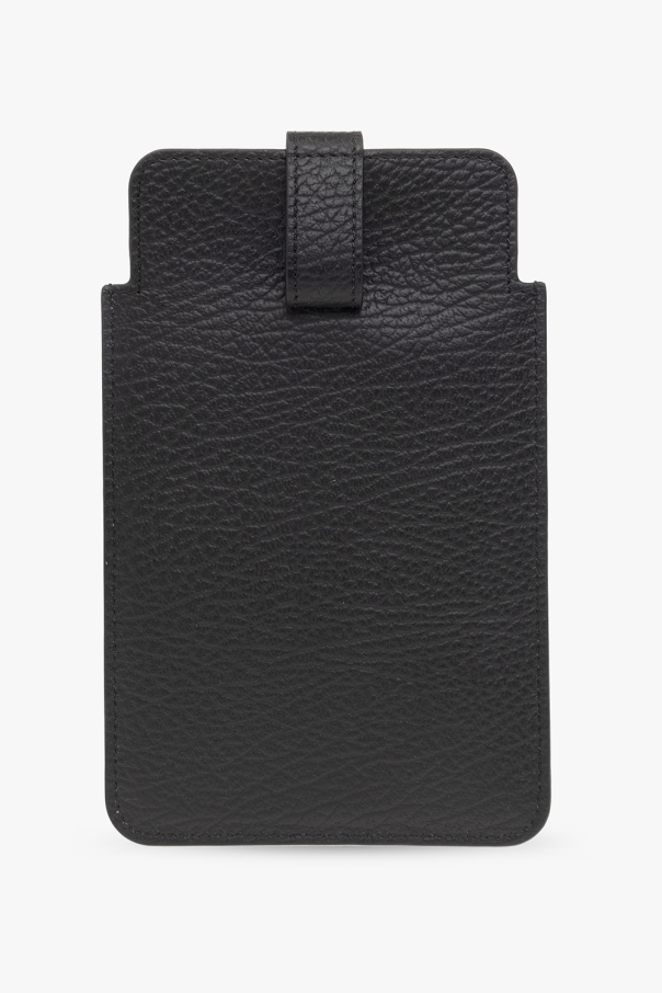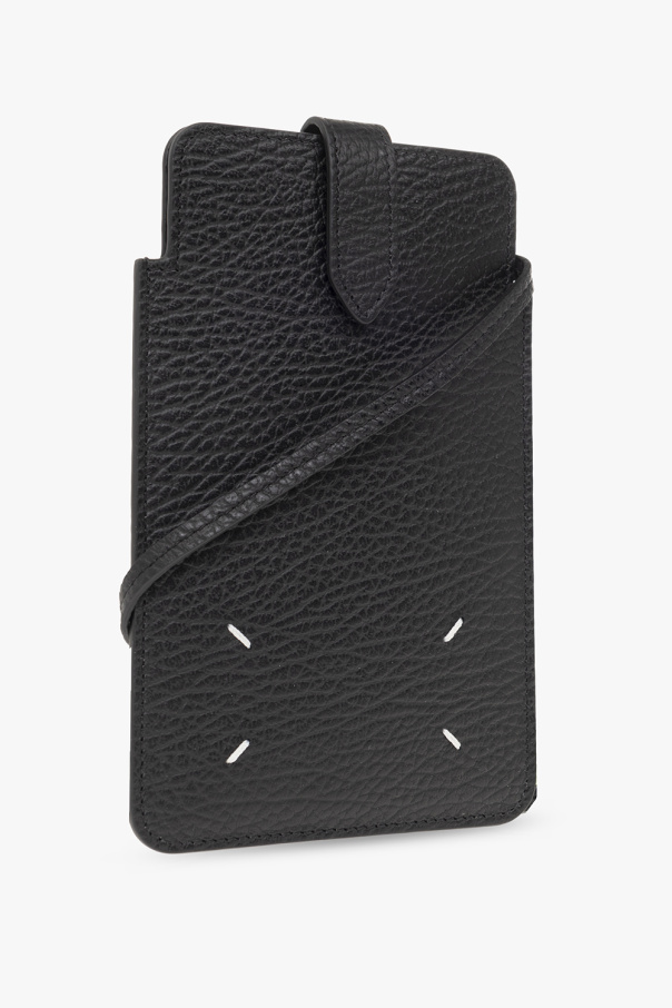 Black phone pouch from Maison Margiela. Crafted from calf leather, this item features a snap closure, white logo embroidery, one internal compartment, detachable and adjustable strap and silver-tone metal hardware.