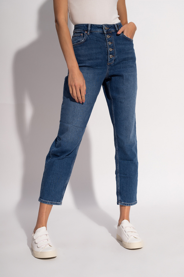 Blue ‘Jules’ jeans from AllSaints. Cut with a high-waisted silhouette, this pair falls down with legs that taper towards the ankles and features silver-tone button closures and classic five pockets.