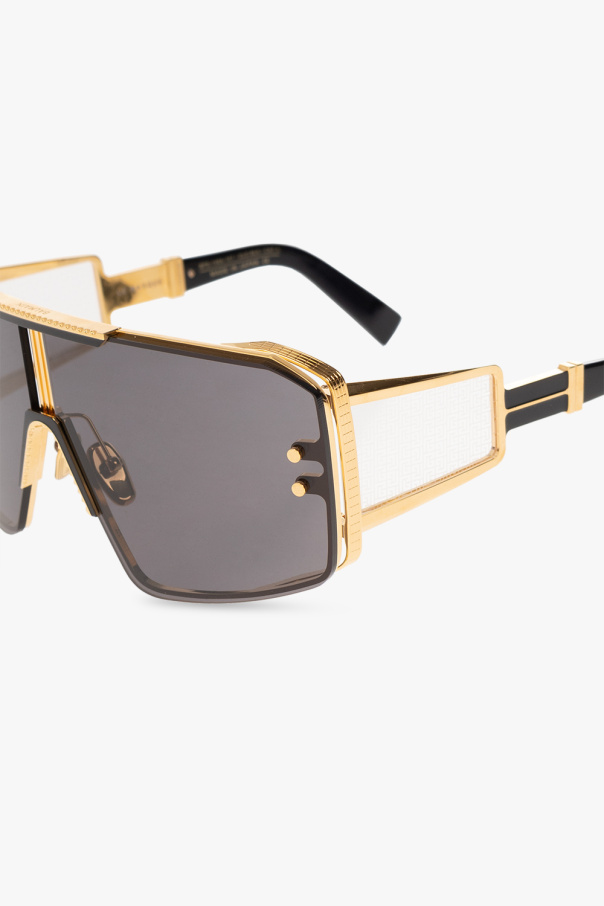 Gold-tone ‘Le Masque’ sunglasses from Balmain. This design features a mask frame with an cut-out insert at the bride and adjustable nose pads, wide temples with transparent details, monogram and black tips as well as a grey anti-glare lenses with 100% UV protection.