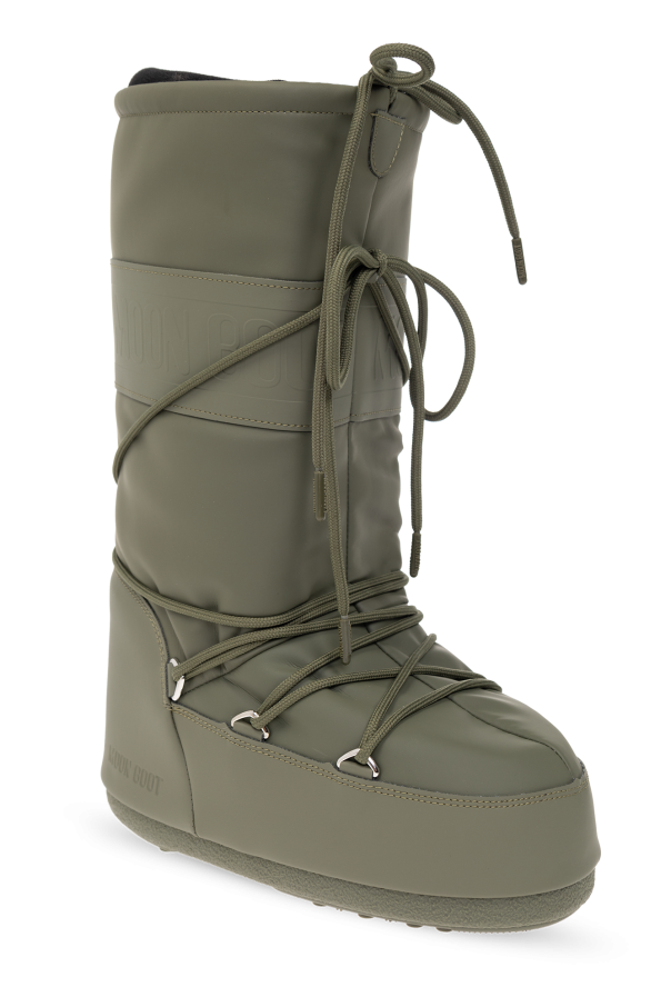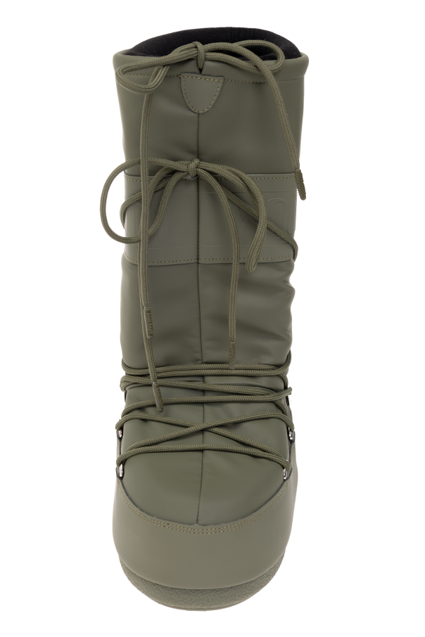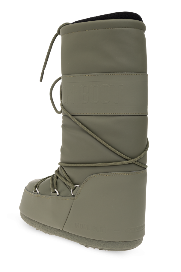 Khaki ‘Icon Rubber’ snow boots from Moon Boot. Made of rubber, this model sits on a khaki tread rubber sole with suction cups to ensure superb grip on any surface and showcases an elasticized collar, logo detailing and elastic crisscross tube laces (do not use them to pull off shoes). Inspired by the peculiar shape and technology of the astronauts’ boots, the iconic style was designed in 1969 after the first Moon landing.