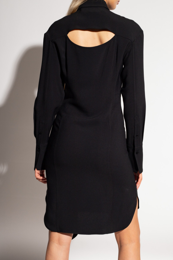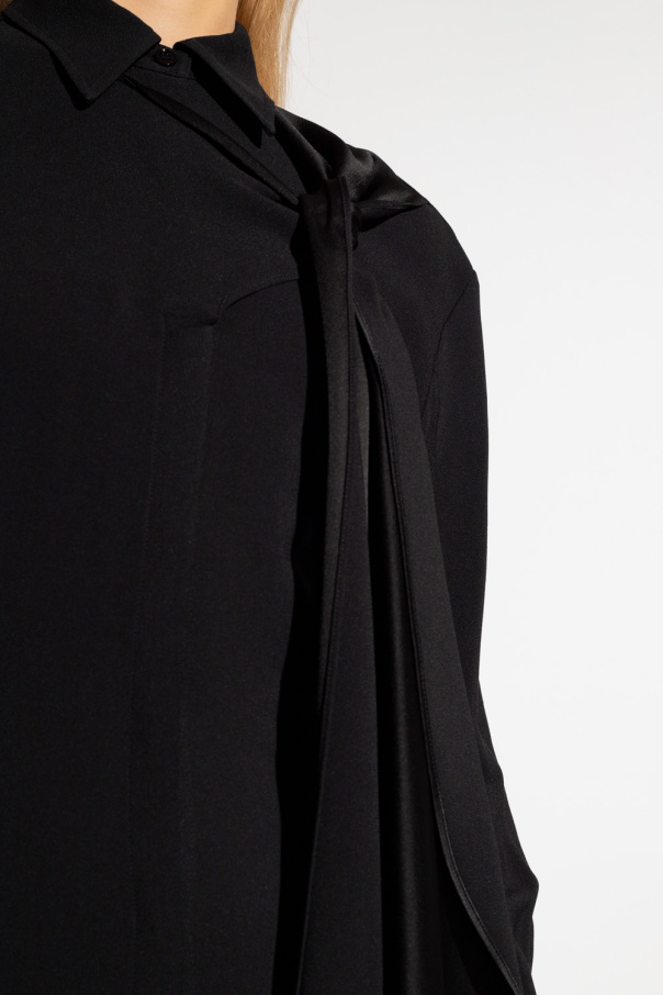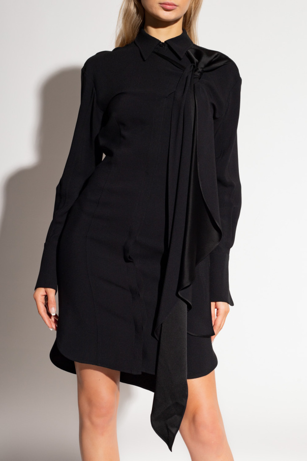 Black shirt dress from Victoria Beckham. Fastened with buttons, this design features a decorative tie neck and long sleeves with buttoned cuffs.