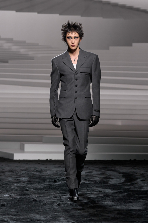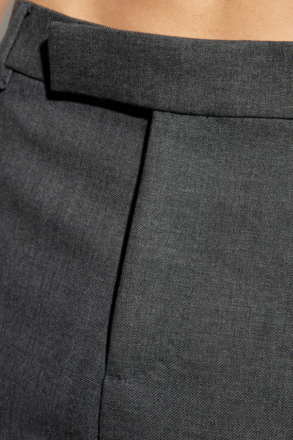 Introducing the epitome of sophistication, these tailored trousers from the esteemed House of Versace are a testament to timeless elegance and modern flair. Crafted from the finest wool, they offer unparalleled comfort and durability, perfect for the discerning gentleman. The trousers feature a classic straight cut with a sharp crease, exuding a formal and polished demeanor. Their minimalist design, devoid of any patterns, enhances their versatility and universal appeal. The refined gray hue ensures effortless pairing with various wardrobe staples, making them a quintessential addition to any sartorial collection. Meticulously designed, these trousers come equipped with belt loops, front side pockets, and two button-fastened back pockets, providing both style and practicality. The secure closure is achieved with a zipper, metal clasp, and button, ensuring a seamless fit. Why Choose This Product? Exquisite craftsmanship by Versace, a symbol of luxury and innovation. High-quality wool fabric offering superior comfort and longevity. Timeless design with a classic straight cut and sharp crease. Versatile gray color, suitable for both formal and smart-casual occasions. Functional design with belt loops and multiple pockets for convenience.