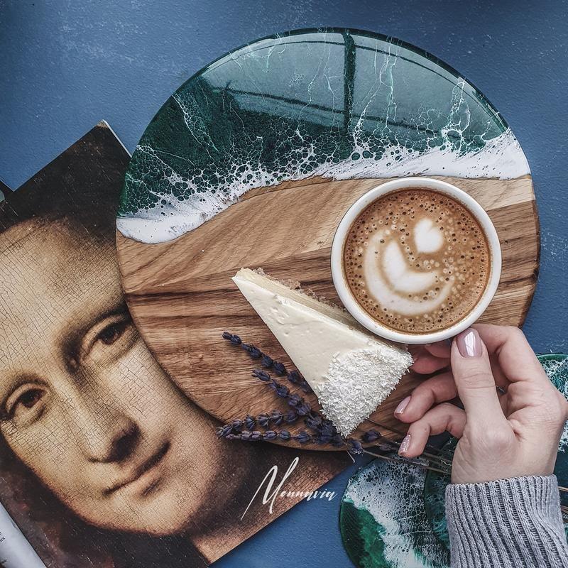 Набір для кухні. Сервірувальна дошка + підстаканники . Дерево-дуб, Англійська епоксидна смола преміальної якості. Екологічно чиста, має сертифікований харчовий допуск.
