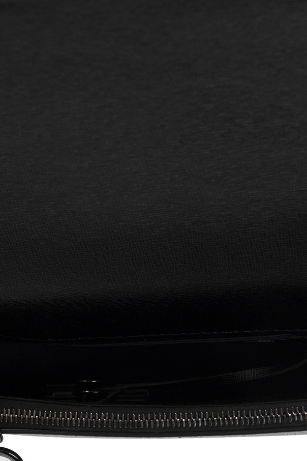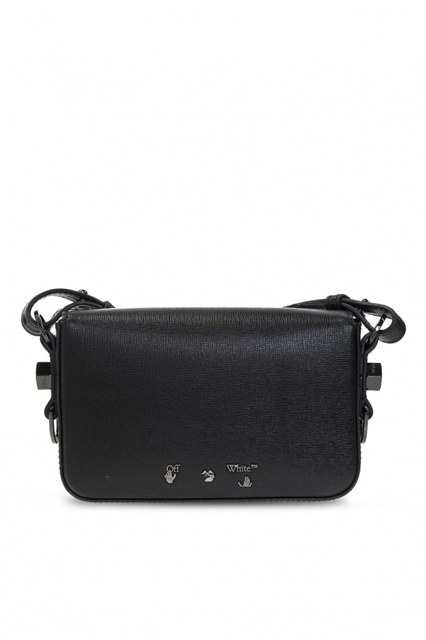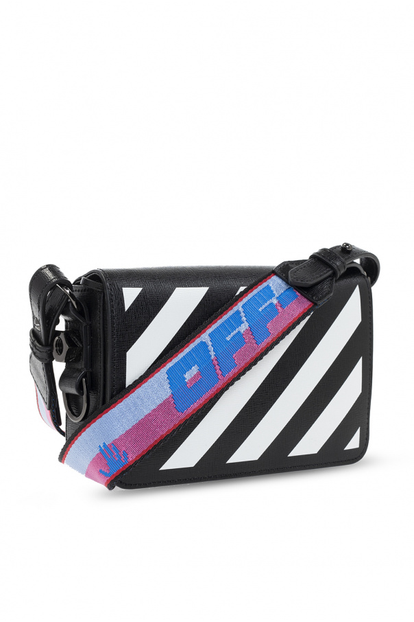Black and white ‘Diag Mini’ shoulder bag from Off-White. Crafted from leather, this model features a fold-over top with a magnetic closure, metal logo appliqué at the back, detachable shoulder strap embroidered with a blue and pink pattern as well as one internal compartment with one zip pocket and two card slots.