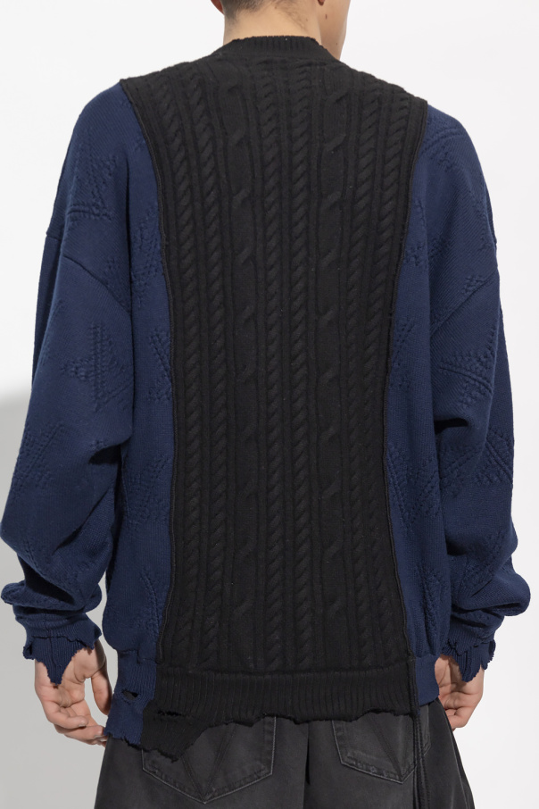 Navy blue and black crewneck sweater from VETEMENTS. Crafted from merino wool with an oversize fit, this style showcases a cable-knit on one part and motif of stars on the other. Featuring a vintage effect throughout, it is complete with ribbed trims on the edges.