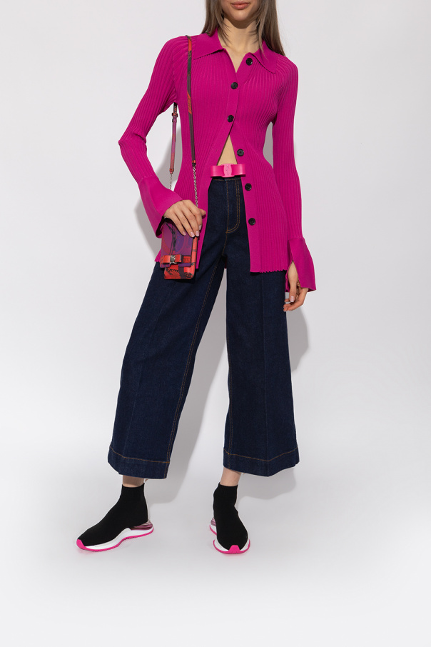 Black ‘Ninette’ sneakers with sock from Salvatore Ferragamo. This model was crafted from soft and elastic recycled nylon, reinforced on the toe and heel to ensure perfect protection and a shape that remains unchanged over time. It features a logo print and a pink and white rubber sole with a dégradé metallic finish.