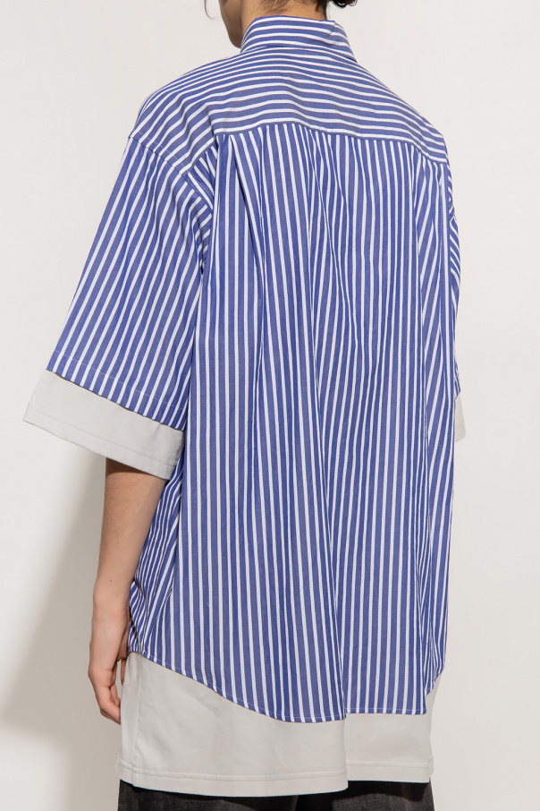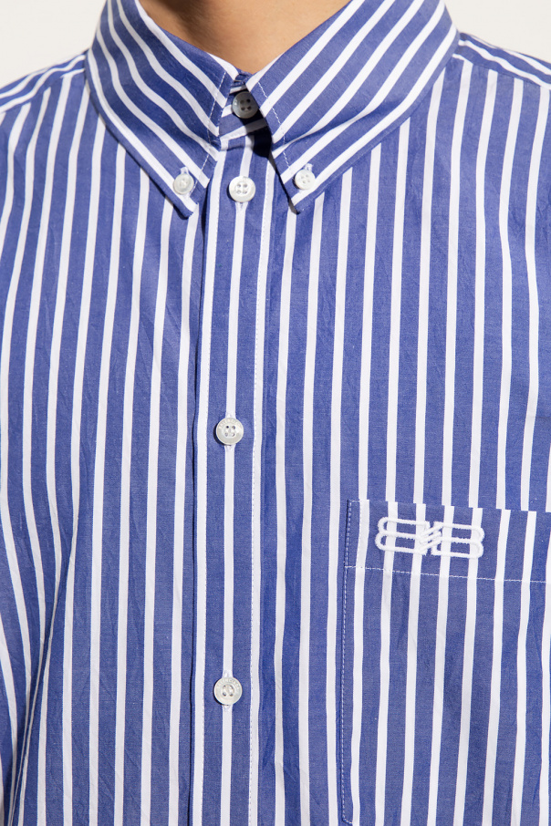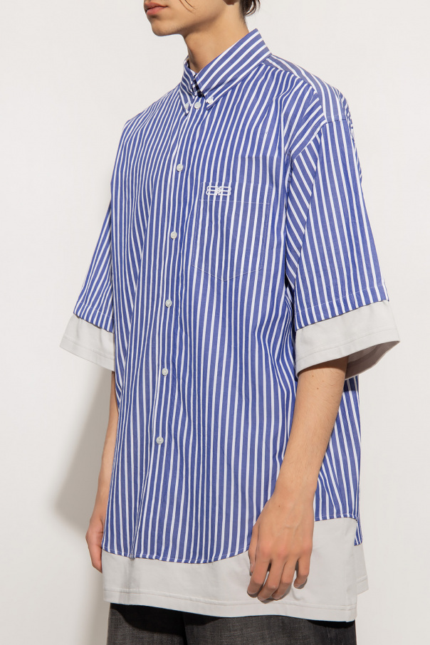 Blue, white and grey shirt from Balenciaga. Made of cotton, this garment features button fastenings, stripe pattern, logo embroidery, slip pocket and short sleeves with decorative trims.