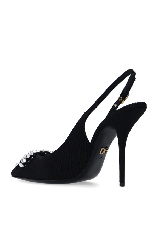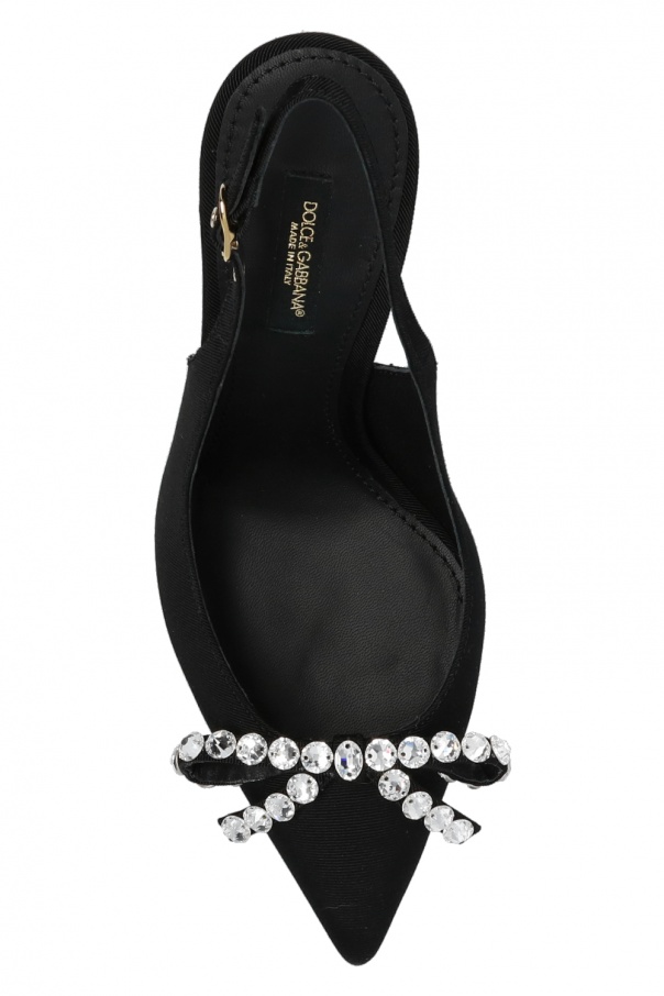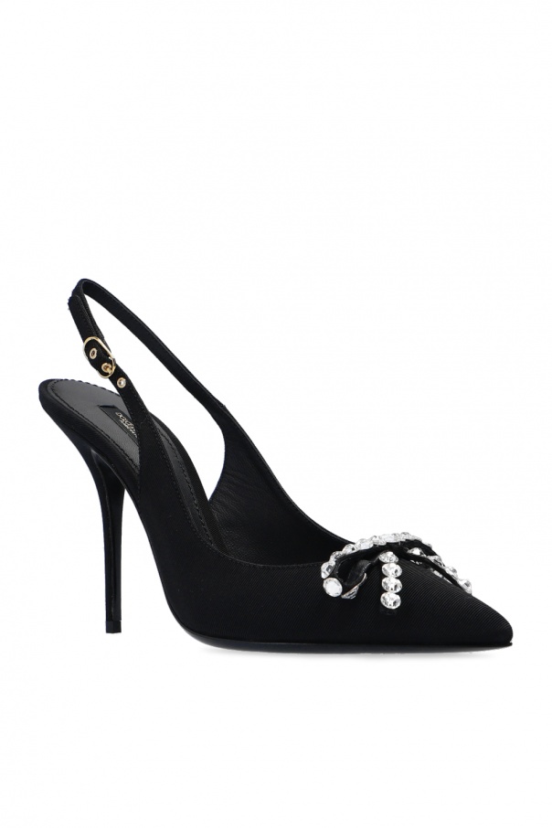 Black slingback stiletto pumps from Dolce & Gabbana. Trimmed with leather, this pair sits on a black leather sole and features a buckle strap, logo detail and a crystal-embellished bow.
