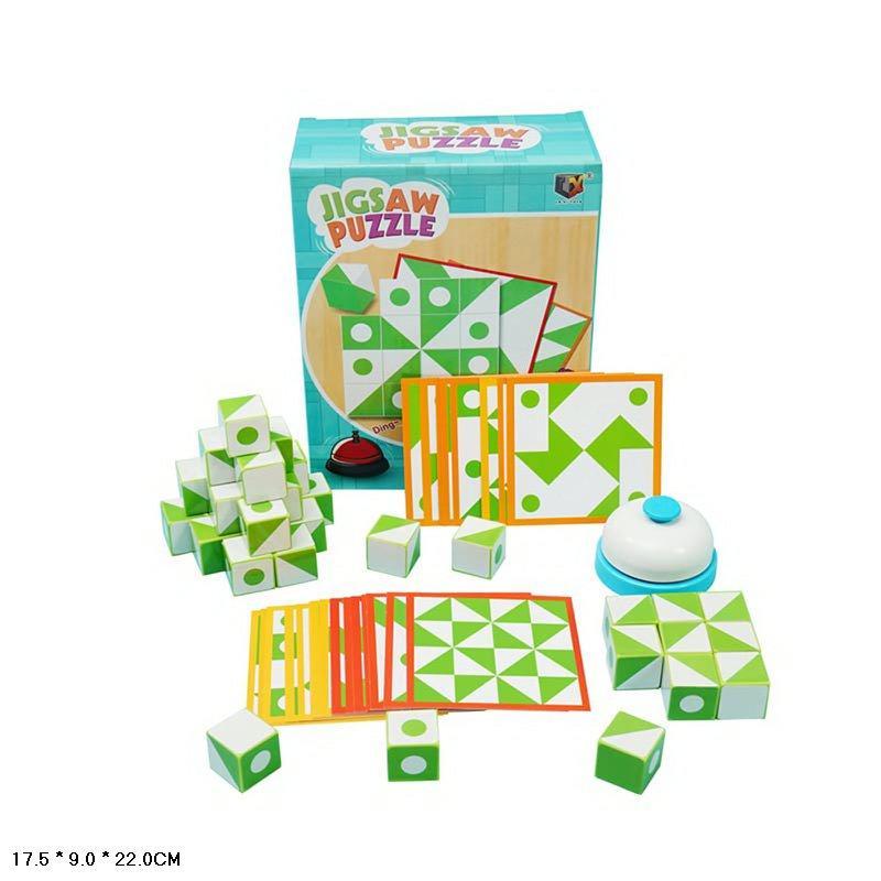 В настольную игру "Головоломка" можно играть как одному, так и вдвоем. В наборе есть два комплекта кубиков, на которые нужно наклеить стикеры с геометрическими формами (есть в комплекте), карточки с изображениями разных узоров и звонок.