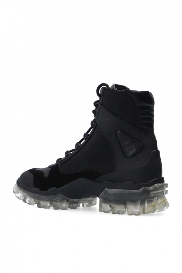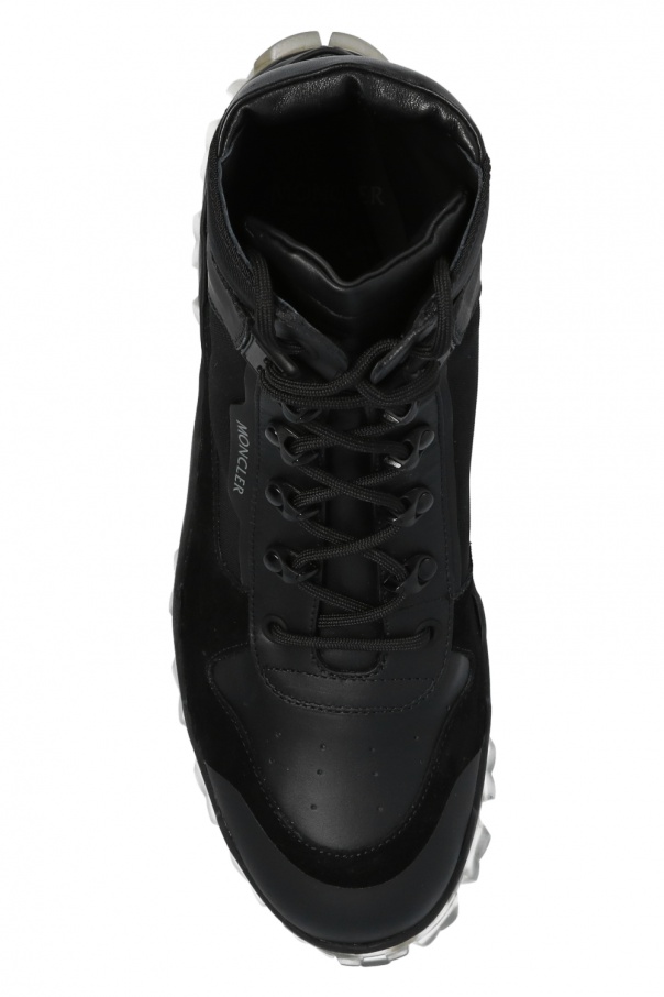 Black ‘Helis Combat’ hiking boots from Moncler. Sporting tactile logo detail, this lace-up pair is set on a translucent, chunky rubber sole and features leather overlays and decorative perforations on the upper.