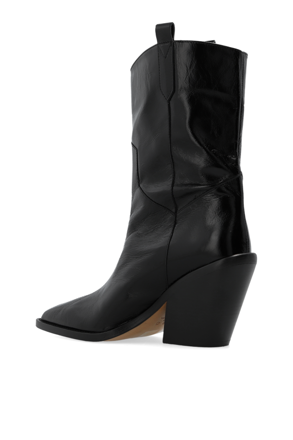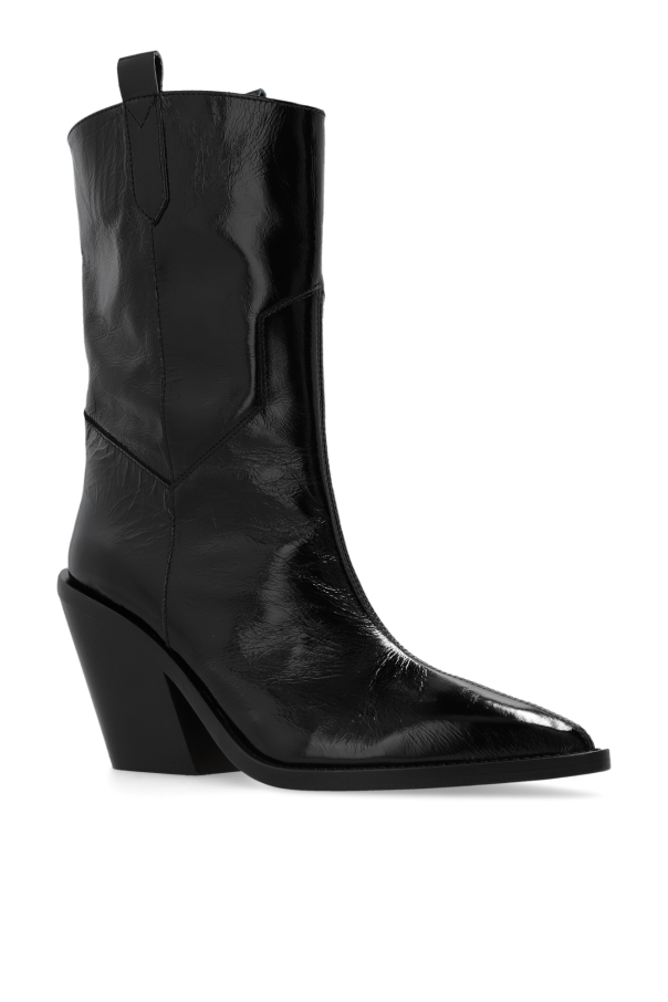 Black ‘Mazola’ cowboy boots from Iro. Made of patent leather, this slip-on pair features a pointed toe, angled heel and brown leather sole.