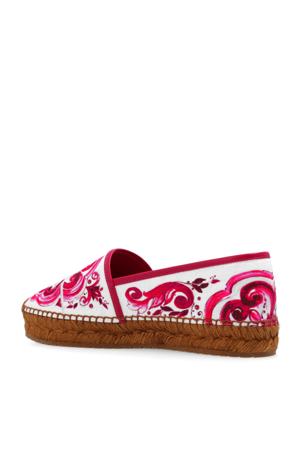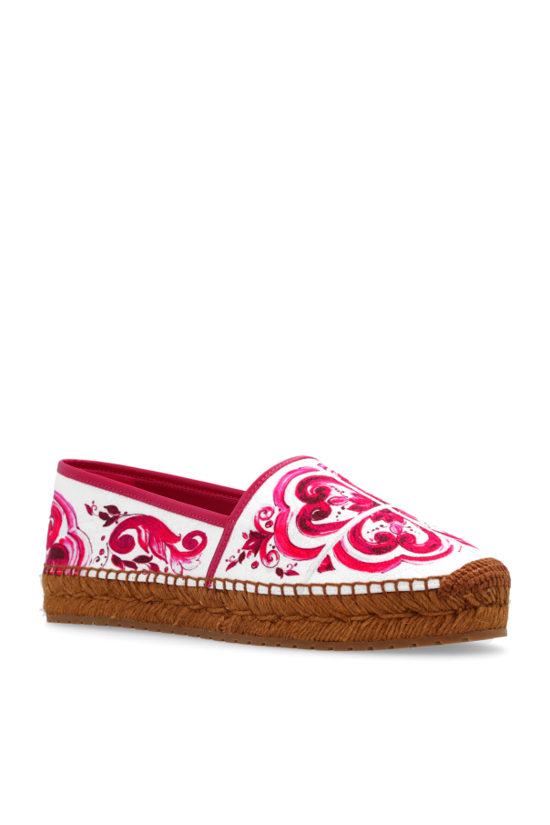 White and pink espadrilles from Dolce & Gabbana. Made of leather, this model sits on a beige rubber sole and showcases a decorative graphic pattern.