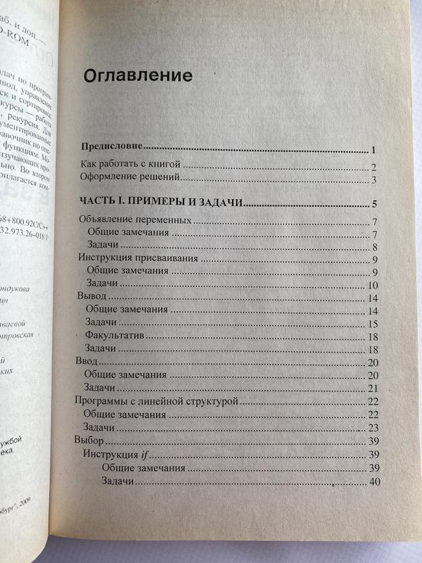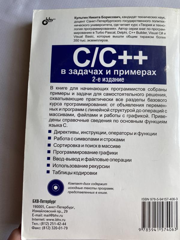 Книга представляет собой сборник примеров и задач по программированию на языке C / C++, как типичных — ввода-вывода, управления вычислительным процессом, работа с массивами, поиск и сортировка, так и тех, которые обычно не входят в традиционные курсы.Книга приобретала более 10 лет назад, не использовалась, есть диск с приложениями. Бумага немного пожелк, есть залами на переплете (мягкий переплет).
