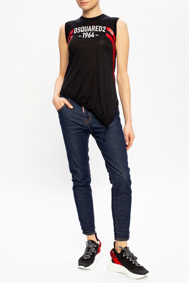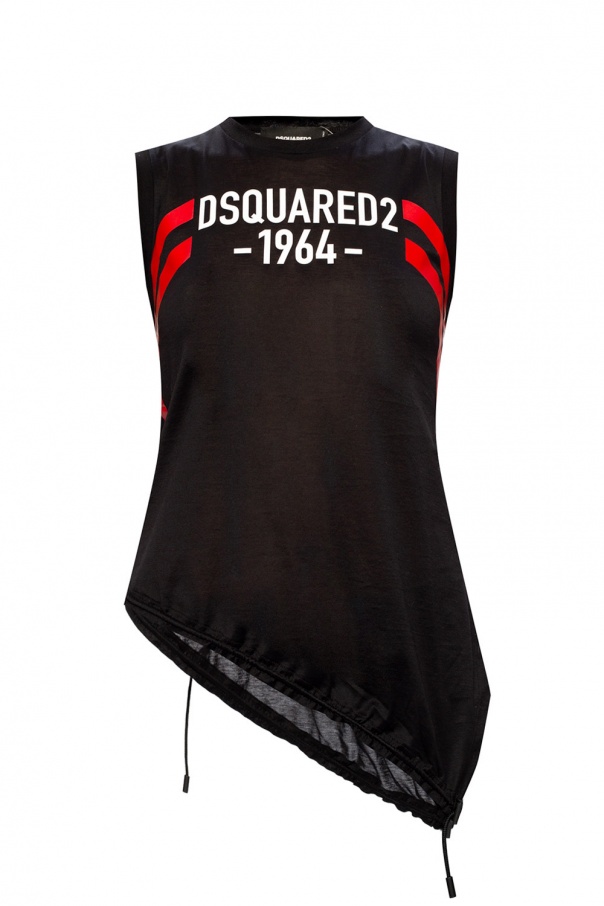 Black crewneck top from Dsquared2. Printed with the brand's logo in white and red across the front, this cotton-crafted style is complete with cinching drawcords.