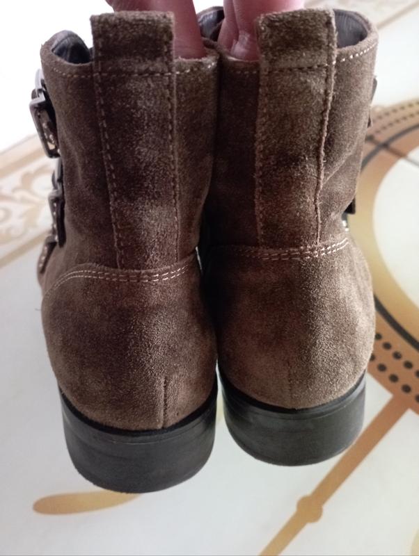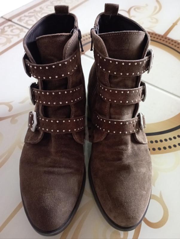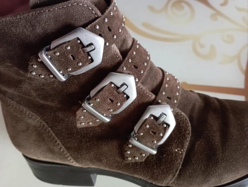 Стильні , фірмові , замшеві черевики з пряжками , збоку застібаються на блискавку , довжина по устилці 24,5 , ширина 9 .