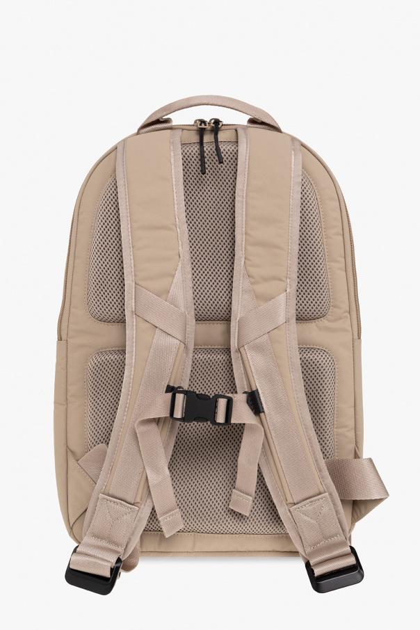 Beige backpack from Y-3 Yohji Yamamoto. Emblazoned with a black and white logo patch, this design secures with a two-way zipper and features a zip front pocket, adjustable shoulder straps, black metal hardware and one internal compartment.
