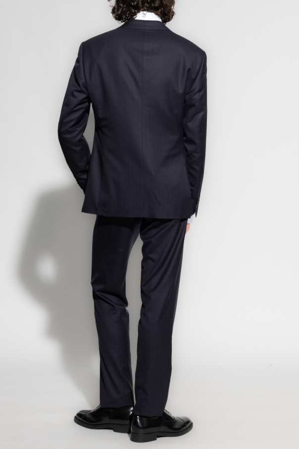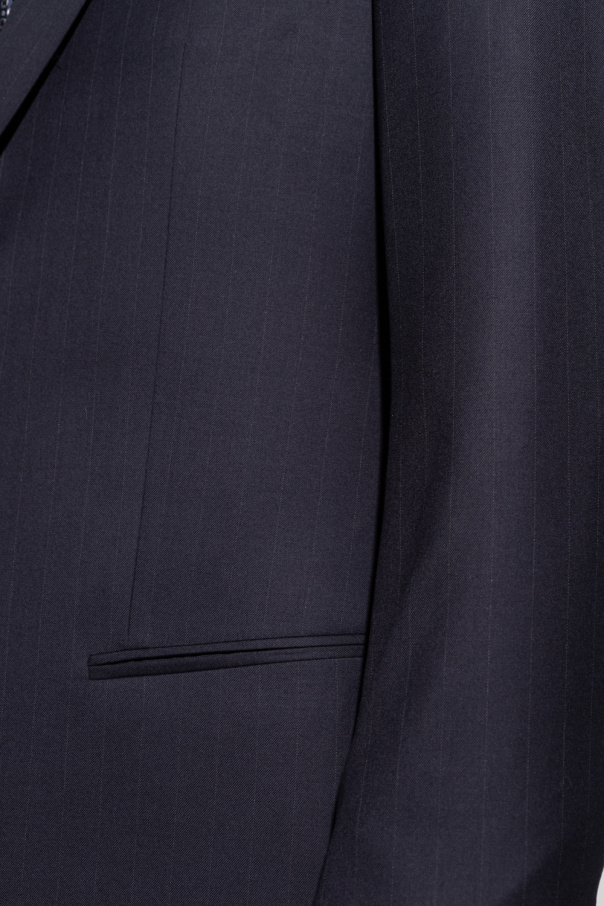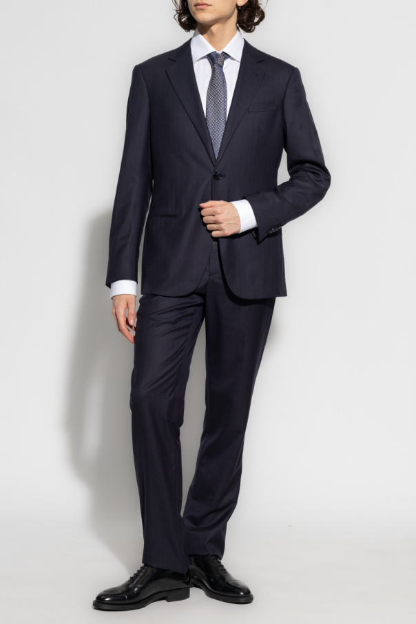 Navy suit from Giorgio Armani. Made of wool, this set is decorated with a pinstripe pattern. The blazer features notch lapels, button fastenings, long sleeves and double rear vent. The trousers feature a zip and button closure, two front pockets, two buttoned back pockets and slightly tapered leg.