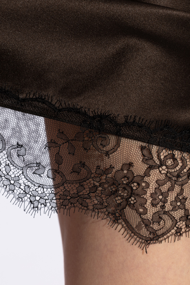 Introducing the quintessence of nocturnal elegance, the Lingerie-Style Dress by The Attico. This exquisite piece, with its deep black hue, seamlessly blends the allure of night with the sophistication of silk. Crafted from 100% silk, its smooth, satiny texture provides an unparalleled wear experience, promising both comfort and glamour. The dress features a round neckline and delicate, adjustable straps, ensuring a perfect fit for any silhouette. The fabric gracefully contours the body without constricting, offering a flattering, yet comfortable embrace. What sets this dress apart is the intricate black lace detailing that adorns the hem and neckline. Embellished with floral patterns, the lace injects an element of refined sensuality, making it a stunning choice for evening wear. The contrast between the lustrous black silk and the textured lace creates a captivating visual harmony, rendering this dress a masterpiece of design. Absent of any overt branding, its elegance is undisturbed, allowing the quality of the fabric and the craftsmanship to speak volumes. Why Purchase This Dress? Exclusive Material: Made of 100% silk, offering a touch of luxury with every wear. Exquisite Design: The combination of lustrous silk and detailed lace work exudes elegance. Adjustable Comfort: Fitted yet not constricting, with adjustable straps for personalized fit. Subtle Sensuality: The lace detailing adds a layer of sophistication and allure. Versatile Elegance: Perfect for a variety of upscale events, from dinner parties to galas.