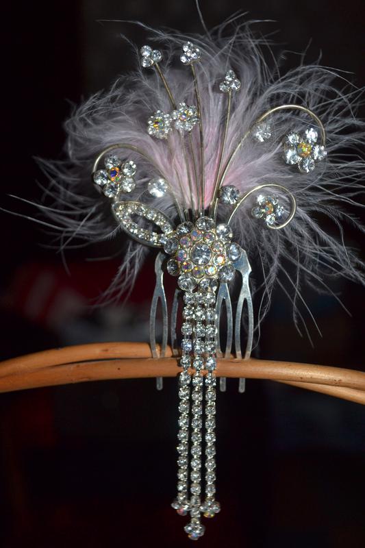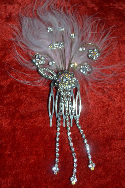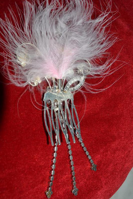 Выполнено в форме гребешка - короны из серебристого металла, инкрустированного камнями Сваровски различной формы и диаметра с нежным пудрово - розовым лебединым пером .