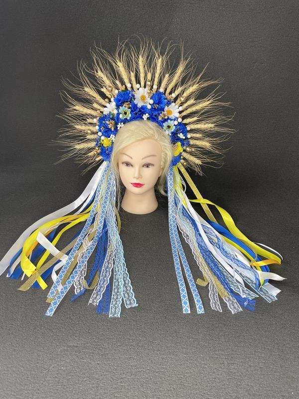 Новий віночок з натуральними колосками пшениці та штучними квітами. Основа металева, обруч універсального розміру, тому підійде як для дитини так і для дорослого.