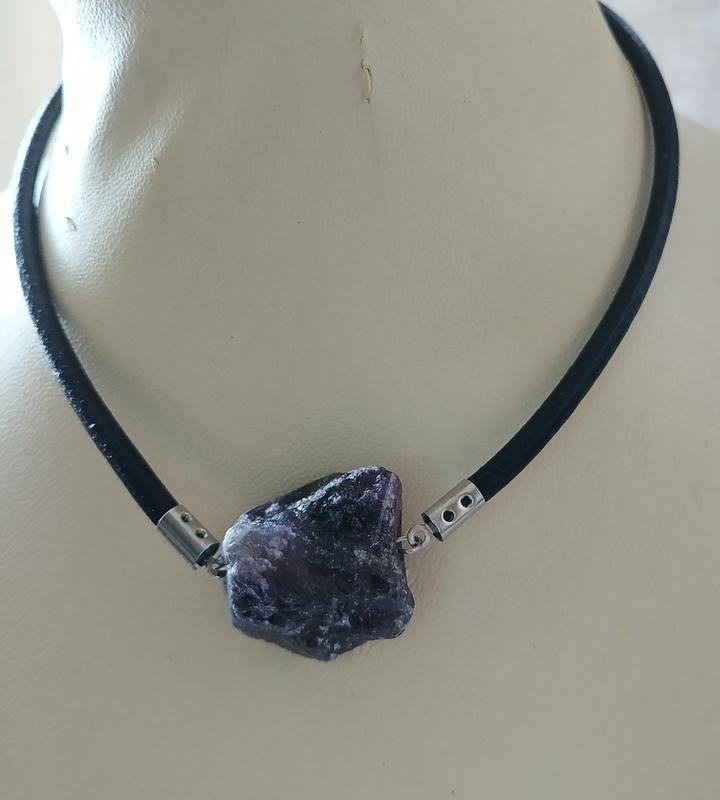 Ультрамодный чокер ручной работы из черного шнура (натуральная кожа) с кулоном из натурального необработанного аметиста на фурнитуре высокого качества из нержавеющей стали. Нержавеющая сталь не потемнеет, не поржавеет, не облезет, не вызовет аллергию и позволит украшению долгие годы радовать хозяйку. Длина чокера 37-43 см, диаметр шнура 4 мм, камень массивный 2,5 х 2,4 см. Есть подобные чокеры с другими камнями.