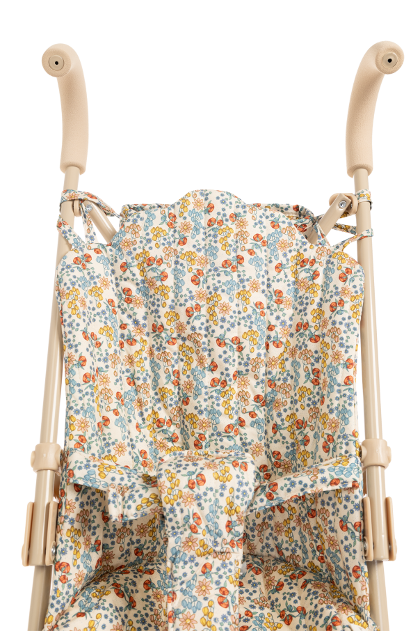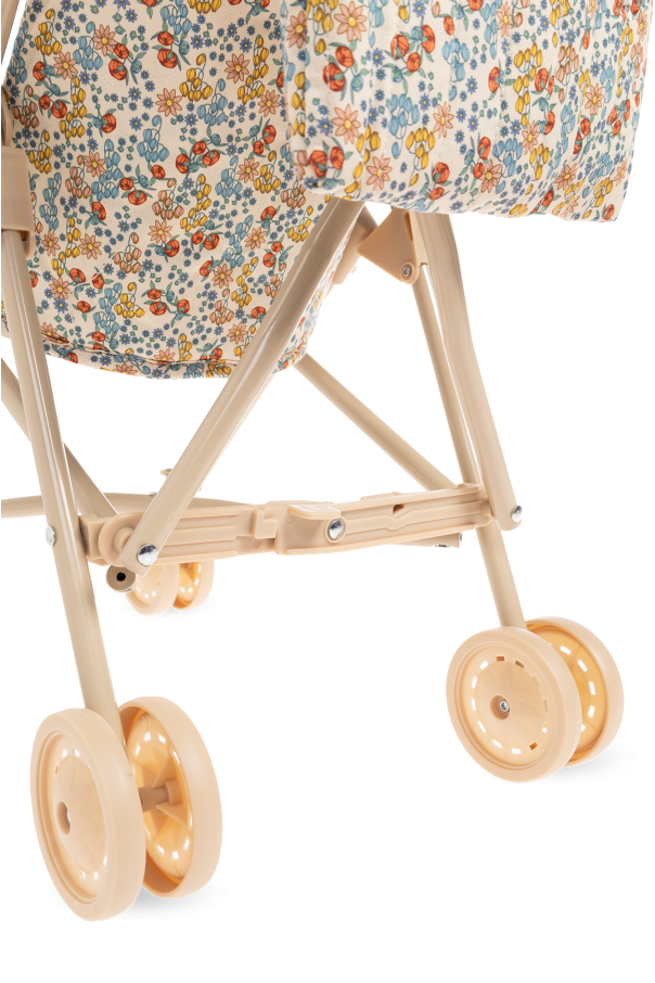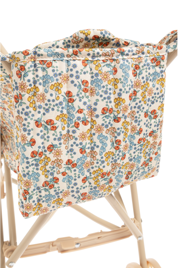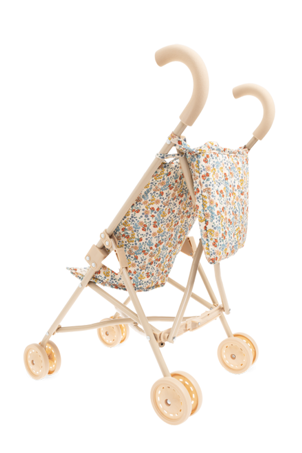 Cream and light beige folding doll stroller from Konges Slojd. The frame is made of iron with spongy soft handles. It is equipped with four large double wheels made in EVA material for extra stability. Comes with a removable seat and carriage bag in floral-printed organic cotton. This item comes fully assembled and is easy to fold and store.
