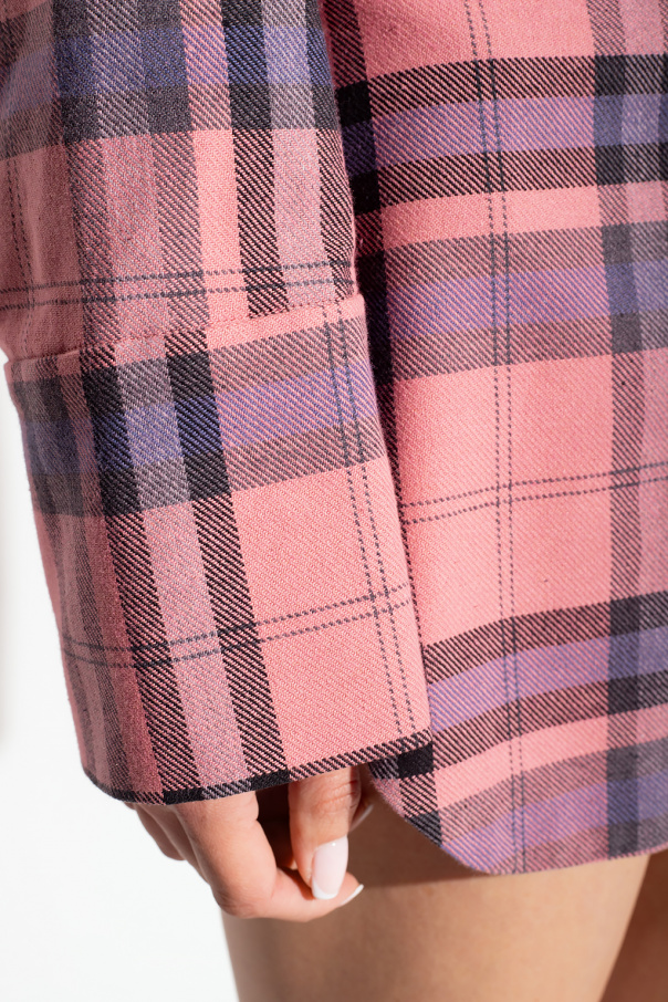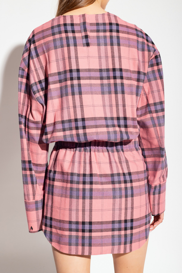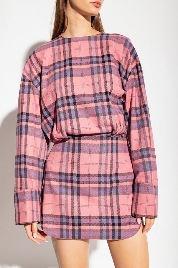 Short, pink dress from The Attico. Fastened with buttons at the back with a concealed placket, this design features a black and blue check pattern, round neck, asymmetric hem and long, loose-fitting sleeves with a logo embroidery.
