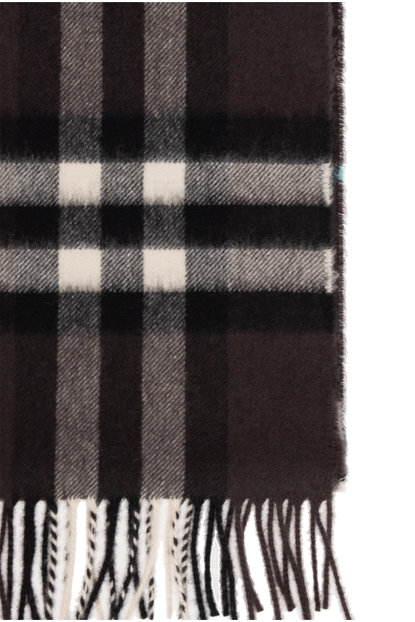 Dark grey scarf from Burberry. Made of cashmere, this design is enriched by the brand’s iconic multicolored check and fringes.