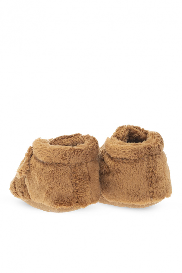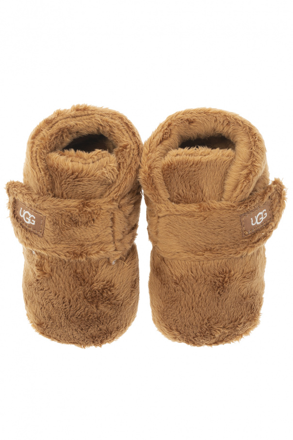 Brown set from UGG. Made of furry fleece, this set includes a beanie with appliqués and a logo patch as well as shoes with hook-and-loop closure, logo patch and brown sole with a slip-resistant rubber print.