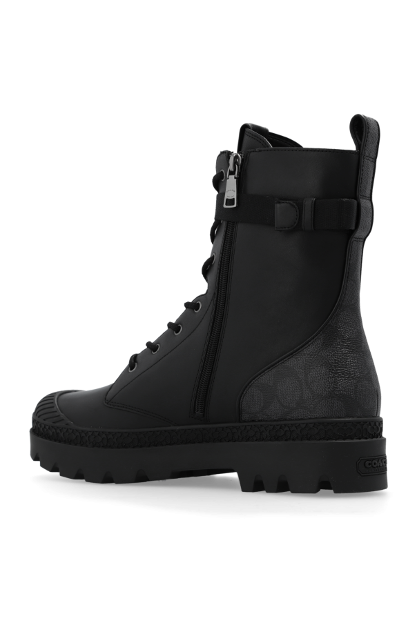 Black ‘Tucker’ lace-up boots from Coach. Made of smooth leather trimmed with monogram canvas, this pair features a zip on the side, decorative strap with a logo buckle in silver-tone and a black rubber sole.