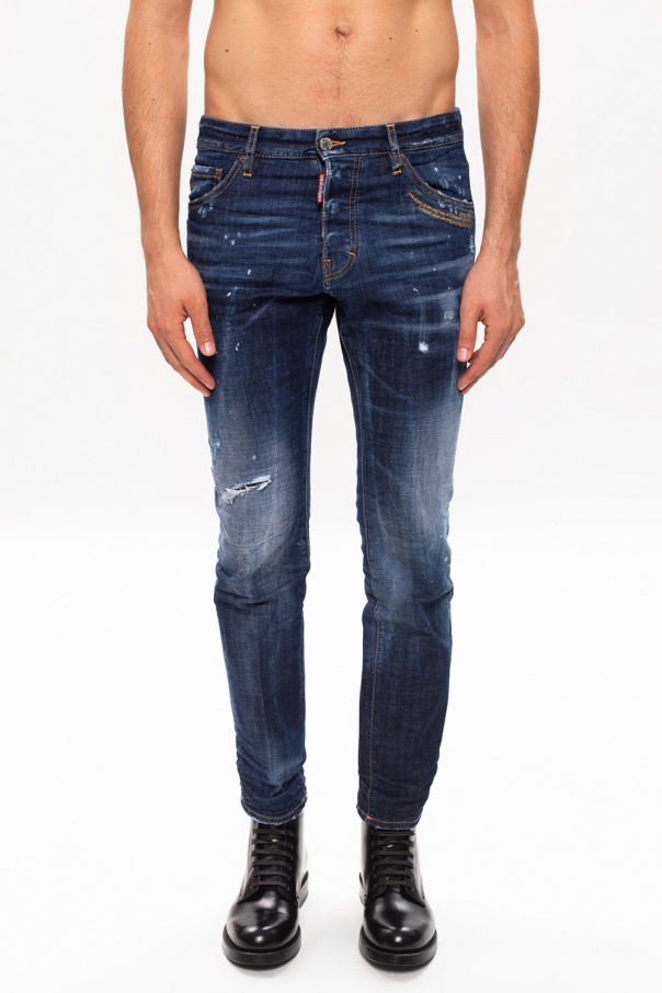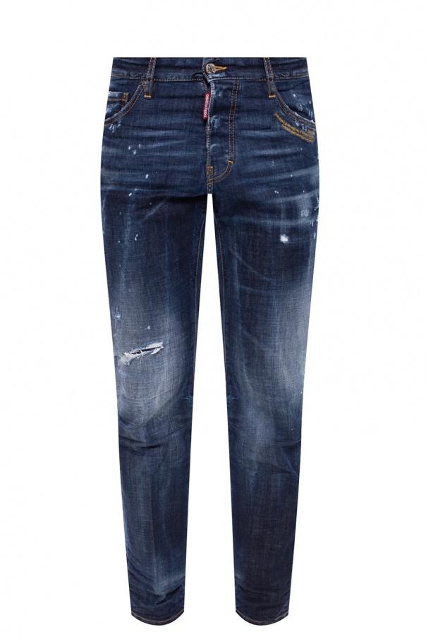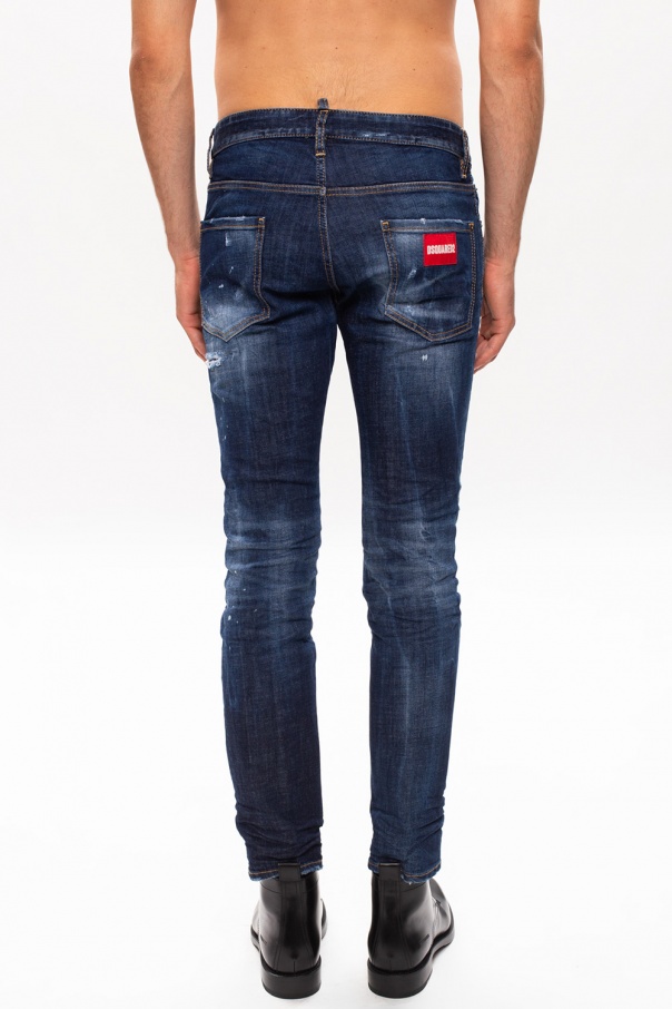 Blue ‘Cool Guy Jean’ jeans from Dsquared2. Fastened with buttons, this tapered leg design features yellow stitching details, embroidered lettering, logo patches, white paint splatter effect, three front pockets, two back pockets and a raw cut edge.