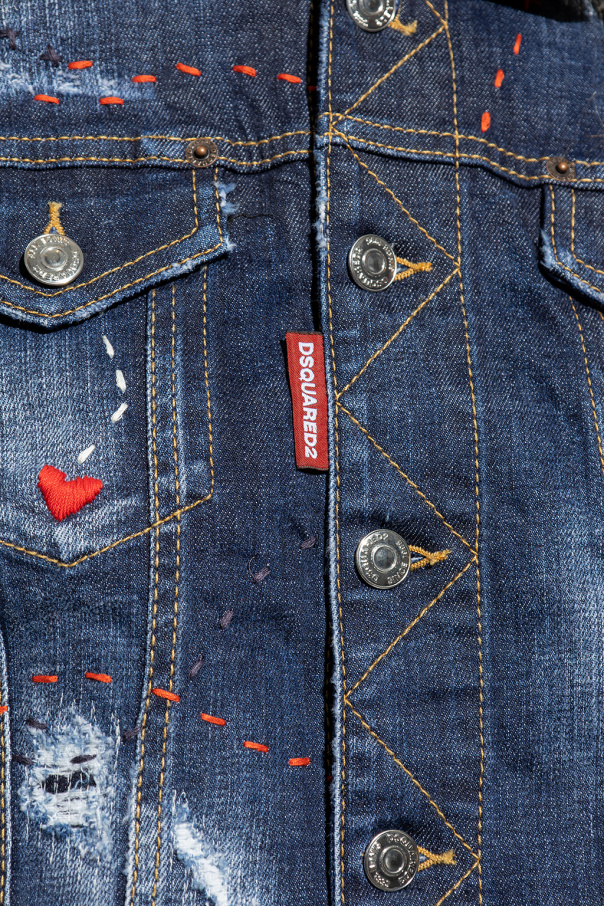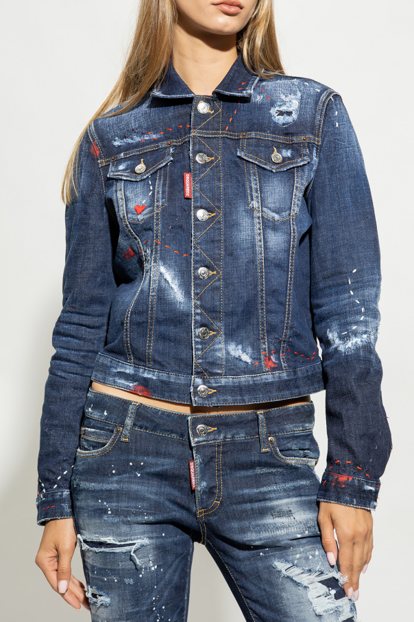 Navy distressed denim jacket from Dsquared2. Fastened with buttons, this garment features a faded effect, paint splatter effect, embroidered heart motif in red, two buttoned flap pockets and long sleeves with button cuffs.