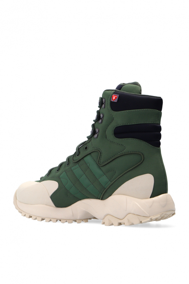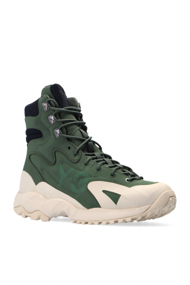 Dark green ‘Notoma’ high-top sneakers from Y-3 Yohji Yamamoto. Embellished with a black and green graphic motif with the brand's logo, this lace-up model sits on a cream rubber sole.