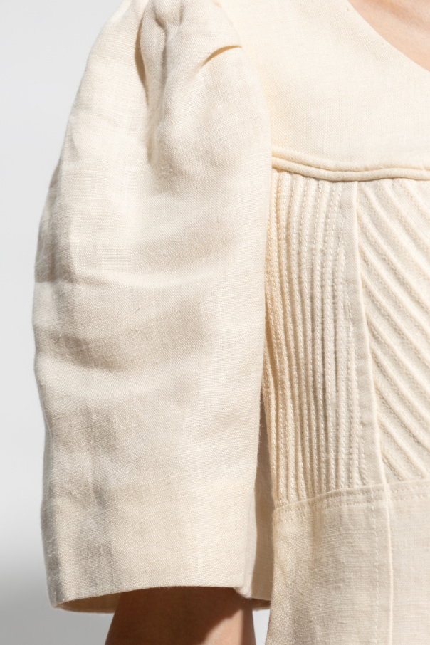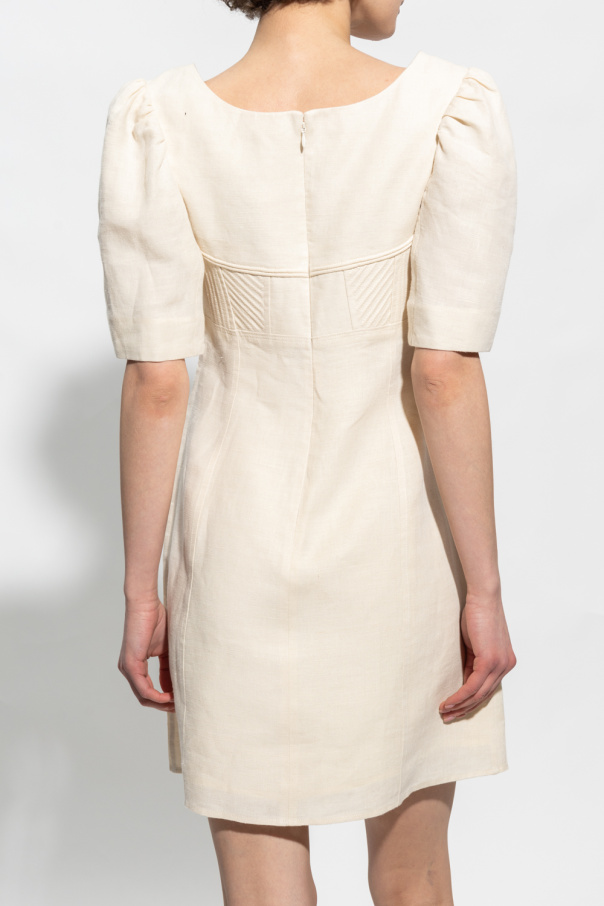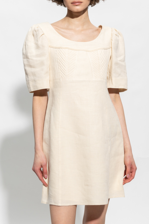 Light beige dress from Chloe. Made of linen and lined with silk, this style secures with a back zipper and hook & eye closure and features a round neck, decorative stitching details and puff short sleeves.